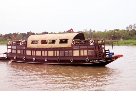 Mékong Authentique est conçu selon les sampans traditionnels qui ont navigué sur la rivière du Mékong. En mesurant 23 m de longue et 4 m de large, en bois combinée et bambou tressé, un style traditionnel typique bien apprécié par les gens qui passent toute leur vie professionnelle et la vie sur l'eau. Pour une croisière agréable et longue dans des conditions confortables, le bateau est équipé d'un compartiment bien ventilé qui pourrait être utilisé comme une salle à manger ainsi que la chambre avec couchettes disponibles pour un groupe de 2 à 30 personnes maximum; outre une cuisine, trois toilettes avec douches, une terrasse sur le pont, un équipage de cinq personnes comprenant le capitaine, un mécanicien, un chef cuisinier, un marin et un guide est à votre service. Les passagers sur la jonque du Mékong Authentique seront surpris et intégrés dans leur découverte des paysages, de la vie locale, de sourire et ouvertes cœur des gens du Delta et de la vie aquatique où qu'ils passent avec le sampan.